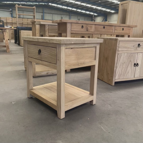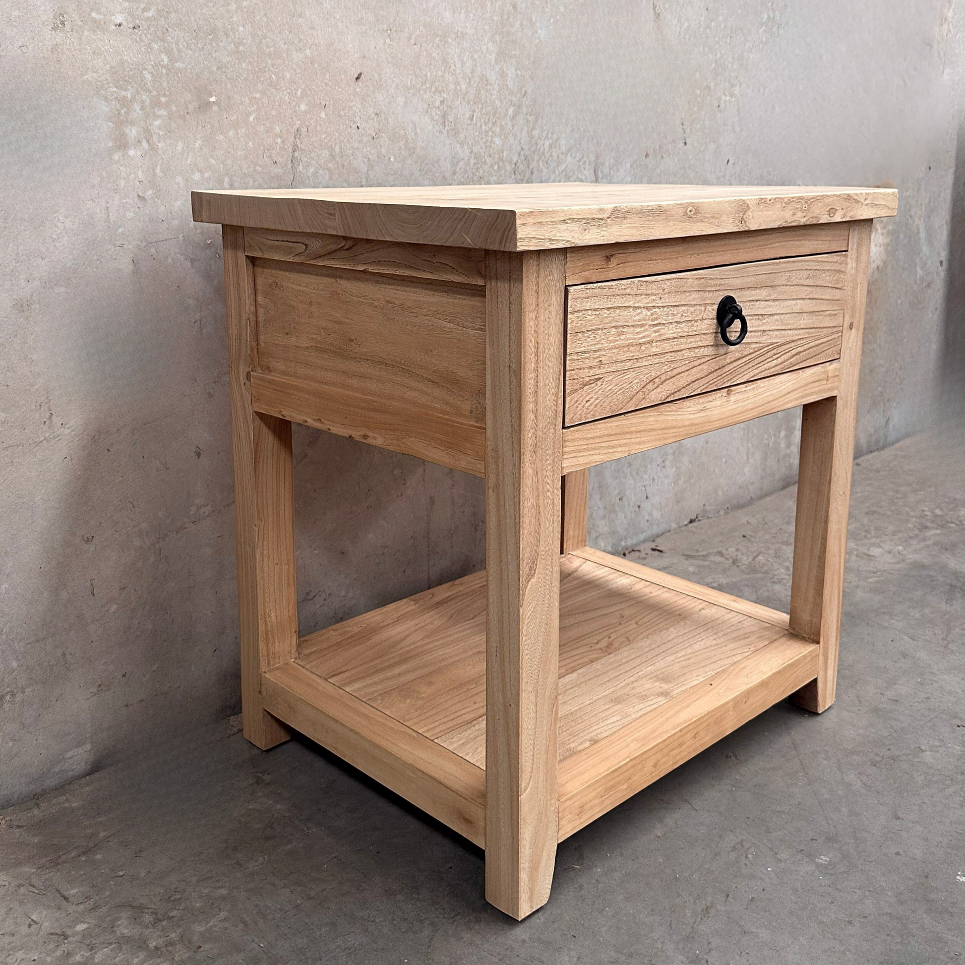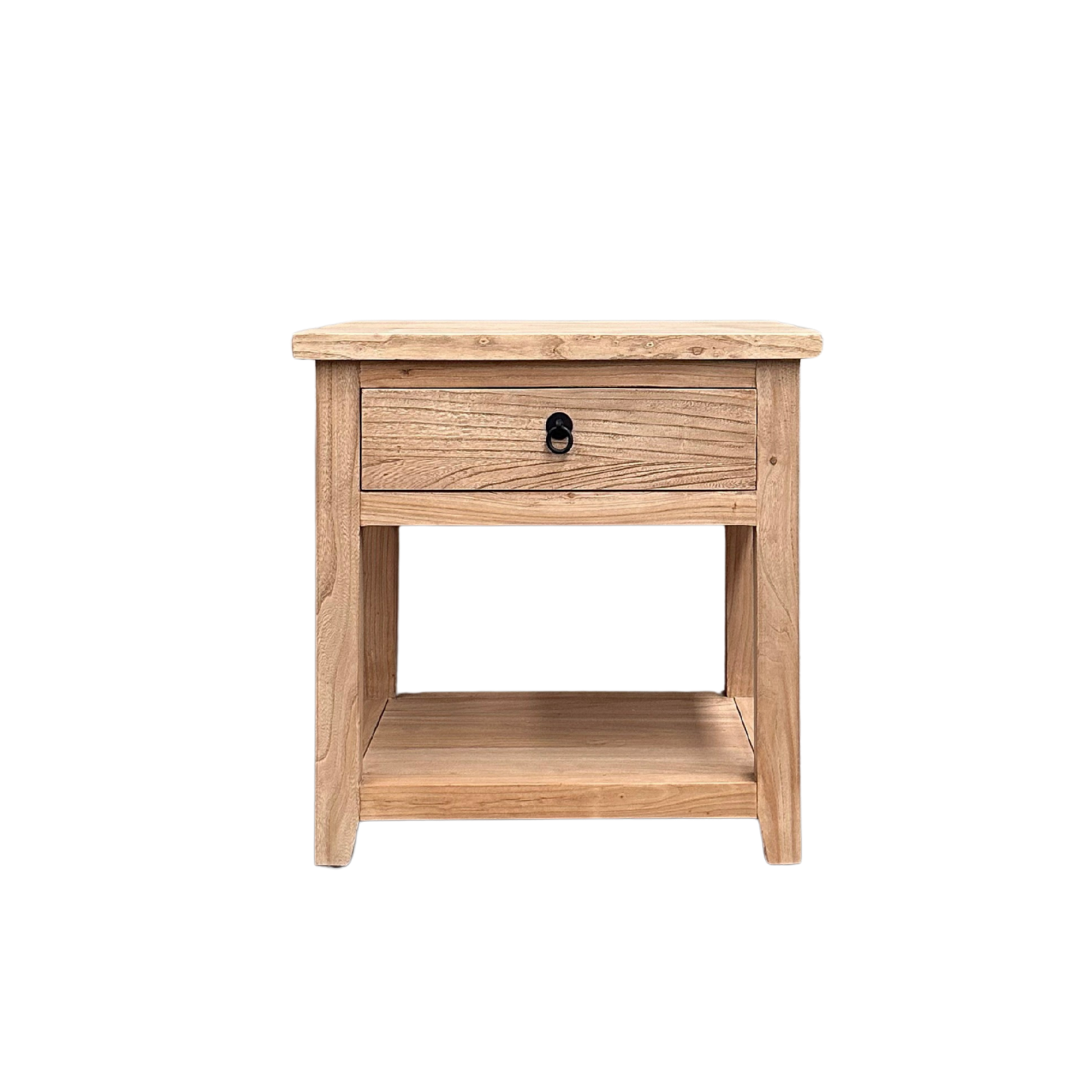 This compact bedside table is crafted from solid natural elm, showcasing the timber’s organic grain patterns, warm tones, and subtle natural imperfections. Designed with a minimalist overhang silhouette, it creates a light, floating effect that's well-suited to contemporary and transitional interiors.
